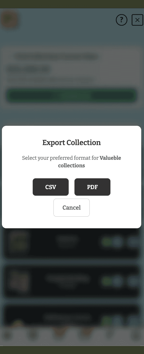 Download your complete collectible data locally in PDF or CSV format with one click.