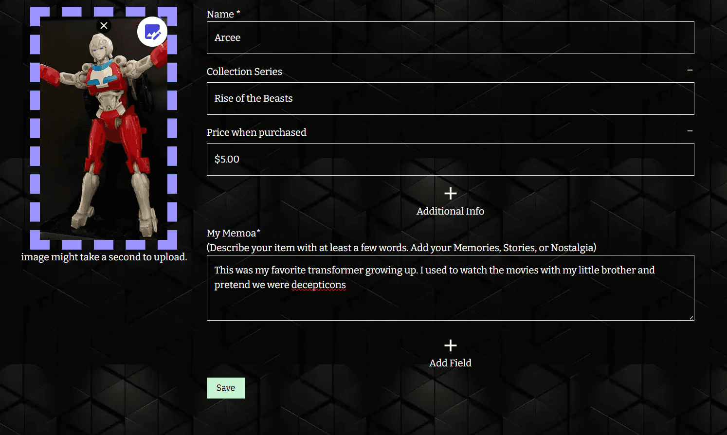Upload photos of your items, add details and custom fields, and document the memories and nostalgia